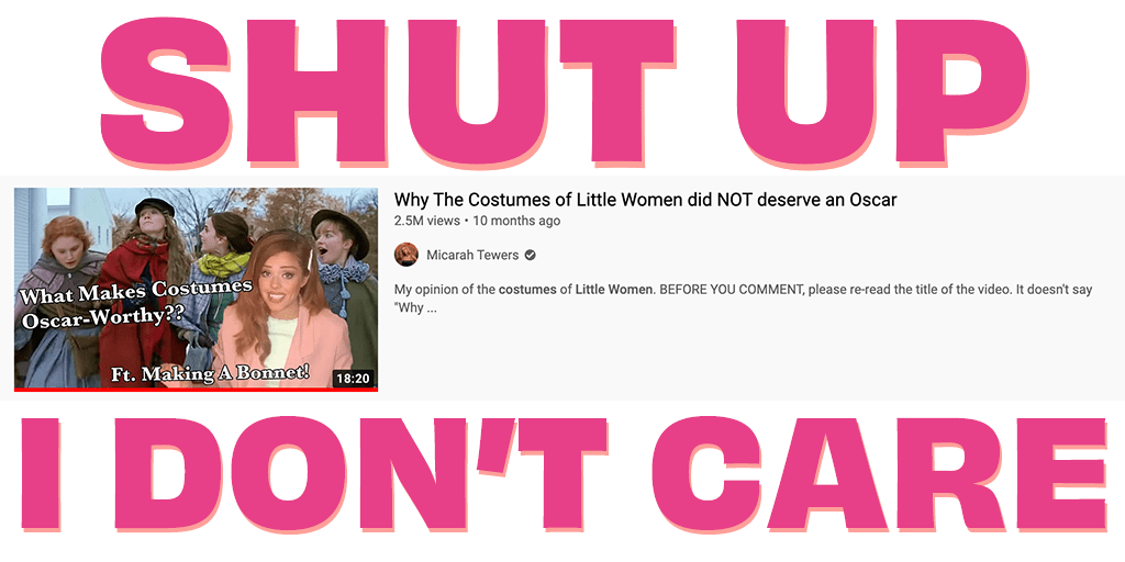 If you’ve been unfortunate enough to watch videos titled “Why The Costumes of Little Women did NOT deserve an Oscar”, “Dress Historian Analyzes ‘Historical’ Film Costumes 😳”, or “Rating Disney Princess Dresses on Historical Accuracy (Part One)”, you probably recognize the tropes. Young woman in vintage costume (bonus points for hand-made recreation of a historical garment) stares into the camera and explicates why this exact shade of blue wasn’t available in England until 1740, that actually the stitching they used on the gown in this fantasy setting that doesn’t replicate a moment in human time was not done by hand, and that all the characters in this movie are wearing stays but the corset was very good actually.*